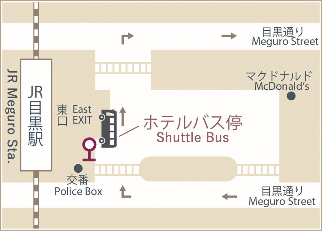 目黒駅東口とホテル間を15分間隔で運行(所要時間 約5分)しております。