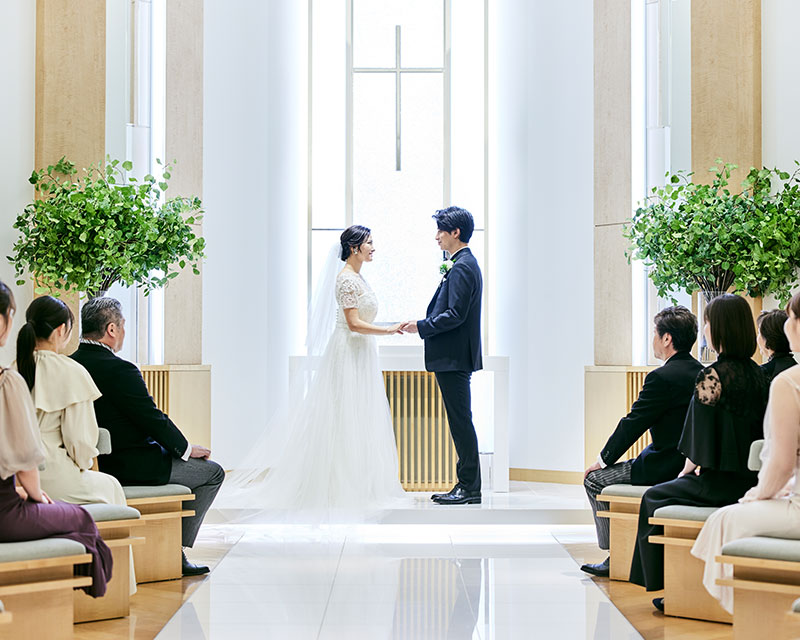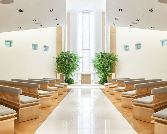 柔らかな木目の椅子と白を基調としたチャペル